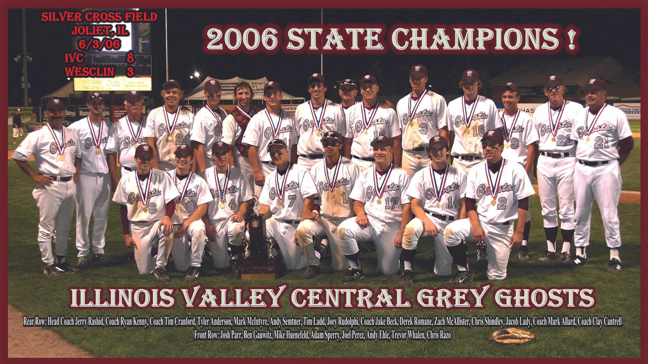 Illinois Valley Central dominated the 2006 Class A baseball tournament, winning the regional and sectional title games, plus the supersectional, by a combined score of 31-0. The Grey Ghosts beat Trenton-Wesclin, 8-3, for the state championship.